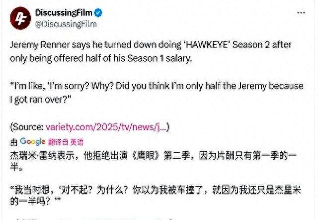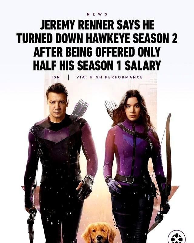 事情是这样的,雷纳在接受一档名为High Performance的节目采访时透露,迪士尼在商谈《鹰眼》第二季时,给出的薪酬竟然只有第一季的一半。